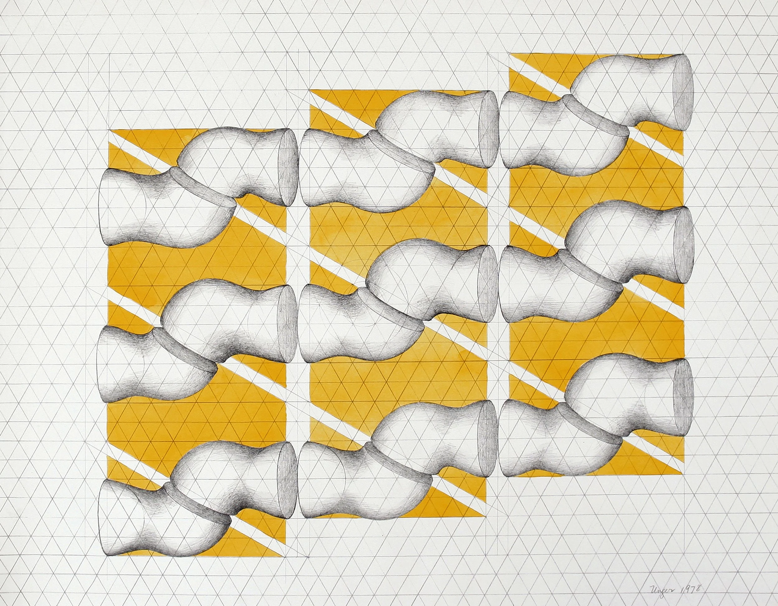 Mary Ann Unger, Untitled (Study for Hexagonal Quintet), 1978, watercolor and pencil on paper, 20.5 x 26.75”, courtesy Williams College Museum of Art and Mary Ann Unger Estate