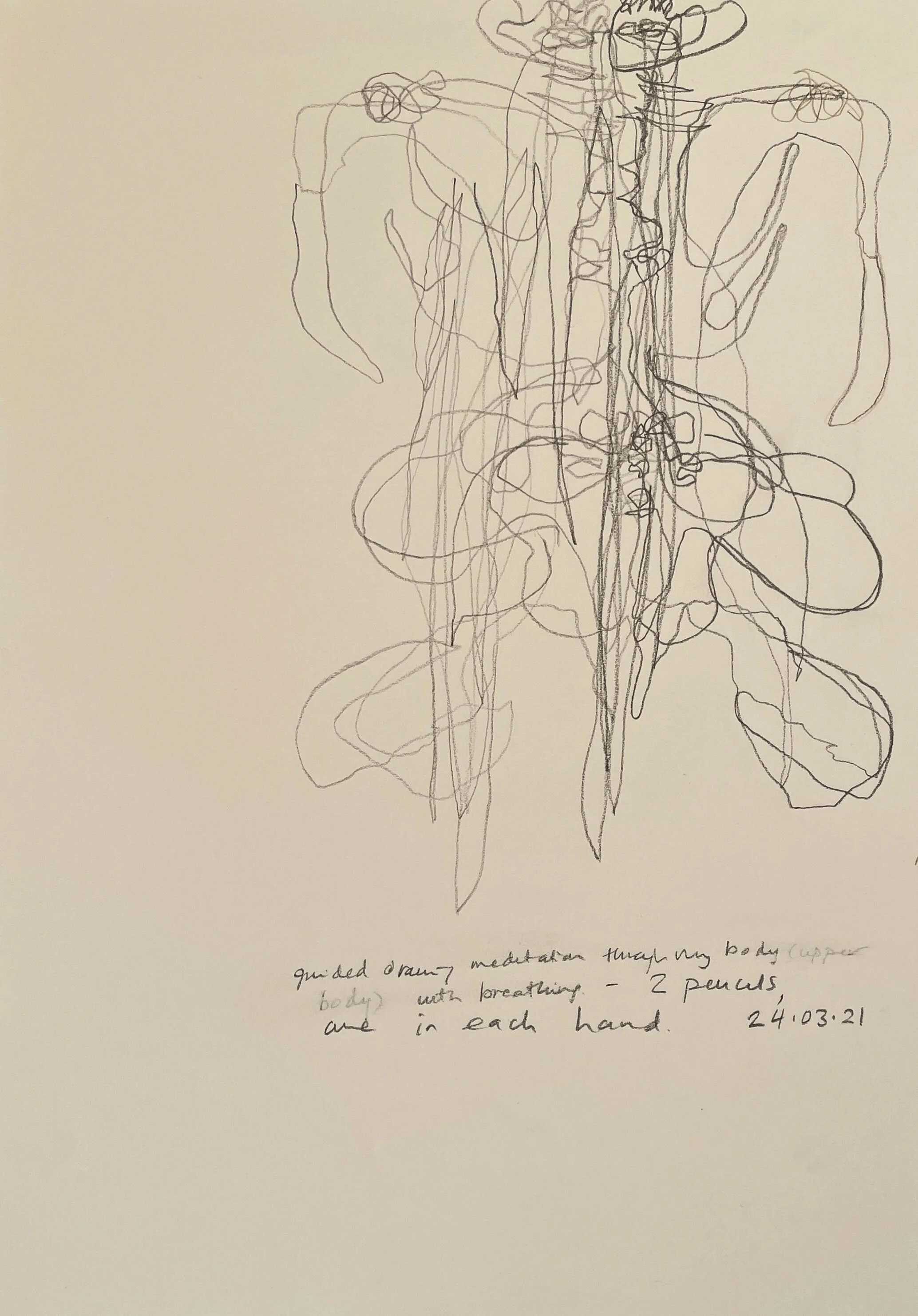 Guided drawing/meditation through my body (upper body) with breathing — 2 pencils in each hand. 24-03-21