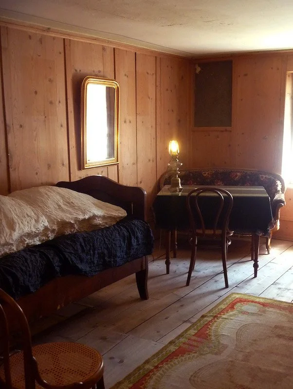But it is Nietzsche’s shelter, his single room on the second floor of the Durisch house in Sils (now the Nietzsche-Haus Museum) that I think of as the taproot of his labors. It was dark, lit by a solitary spirit lamp, and unheated. A period photograph shows broad, bare floorboards with a thin-looking rug; a bed draped in white to one side, a table and chair, and a rather plump sofa in the corner near the one window. Nietzsche proclaimed Sils, and presumably this humble room, to be his “rescue-place...[where] it is quiet in a way I have never before experienced and all the 50 conditions of my poor life are fulfilled...an unexpected and unearned gift.”